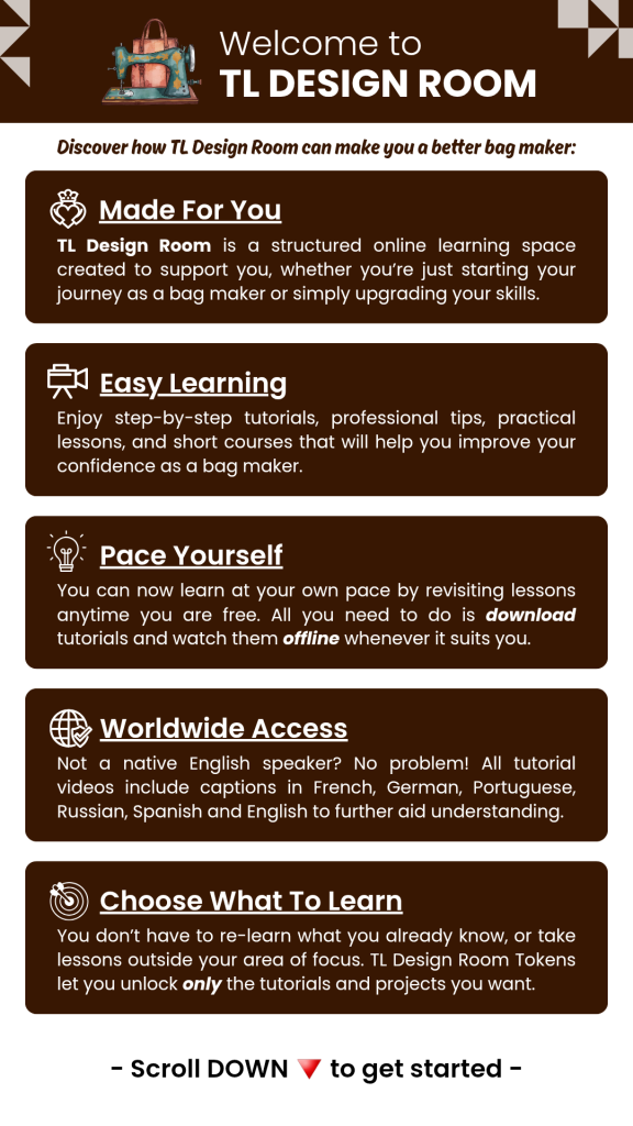 Login to TL Design Room Get TL Design Room Tokens In TL Design Room you have TWO options:#1: Sewing tutorial + PDF pattern [A4/Letter]#2: Sewing tutorial + pattern drafting video Easy - Lunch Carrier - Full Tutorial [No Pattern Needed] Velora - Mini Hobo Bag - Tutorial + PDF Pattern [A4/Letter] Tutorial + Pattern Drafting Video Join TL Design Room Now TL Design Room Terms & Conditions Have any questions or complaints? Contact us HERE.